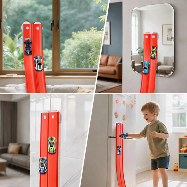 Pritrditev s priseski omogoča otrokom in staršem hitro prilagajanje naklonov in postavitev, zato je mogoče progo vedno znova sestavljati brez orodja ali zapletene priprave.