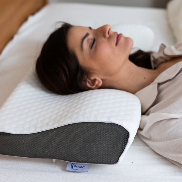 Za vse, ki želite izboljšati občutek udobja med spanjem, strokovnjaki priporočajo spanje v stabilnem in sproščenem položaju – kar je enostavno doseči z ergonomsko oblikovanim vzglavnikom iz spominske pene DERISILK.